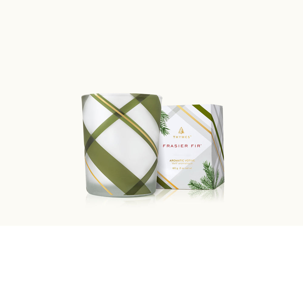 Thymes, Frasier Fir Frosted Plaid Votive Candle, 2 oz.