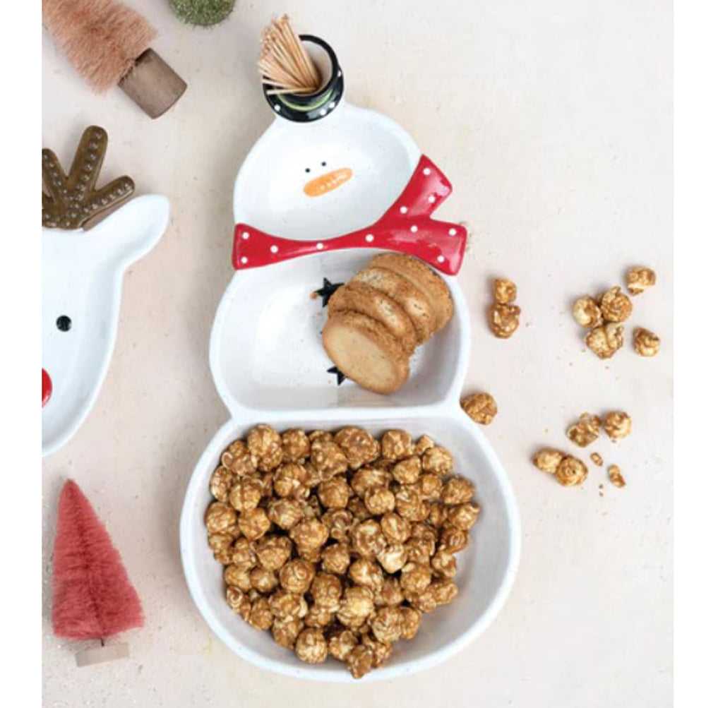 13-3/4"L x 7-1/4"W Stoneware Snowman Dish with Top Hat Toothpick Holder and 3 Sections, Multi Color