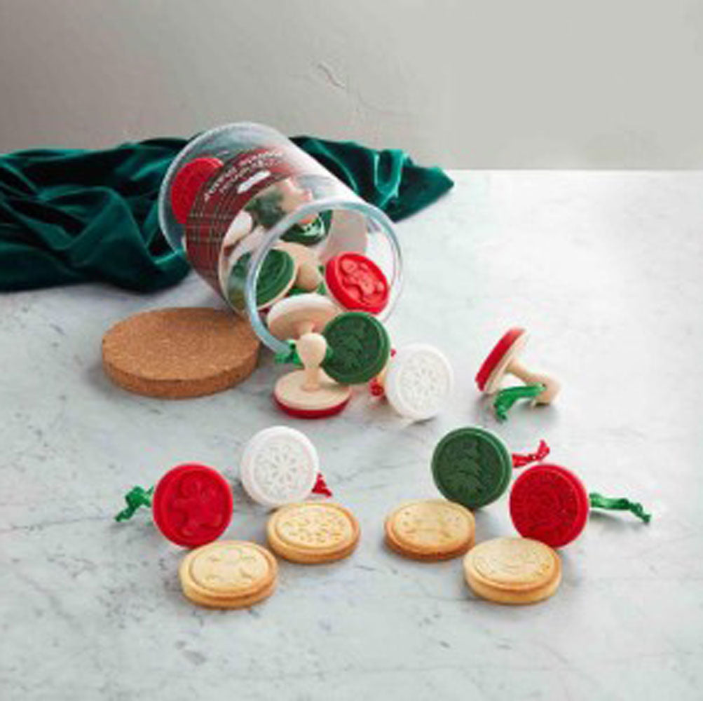 These silicone Christmas cookie stamps with wood handles make festive embossed cookies. Use stamps with a variety of cookie doughs including shortbread, sugar, gingersnap, and peanut butter. Perfect for gift-giving.