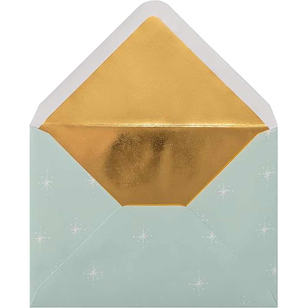 - Christmas card measures 5³ x 7³ and comes with a color-coordinated sky-blue envelope with white stars on it and shimmery gold lining