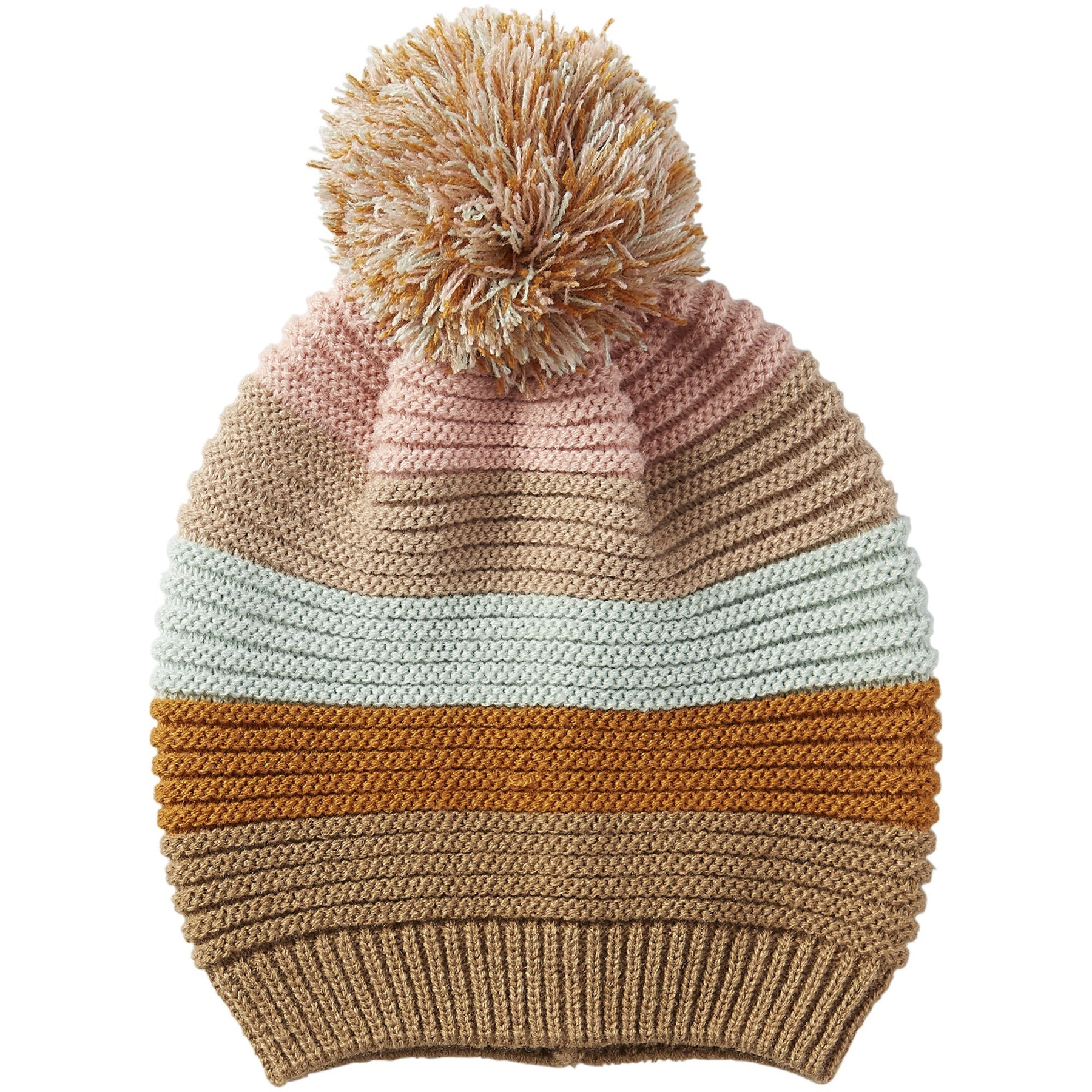 Bold colors and oversized stripes paired with a multicolor pom makes the perfect cold-weather beanie.