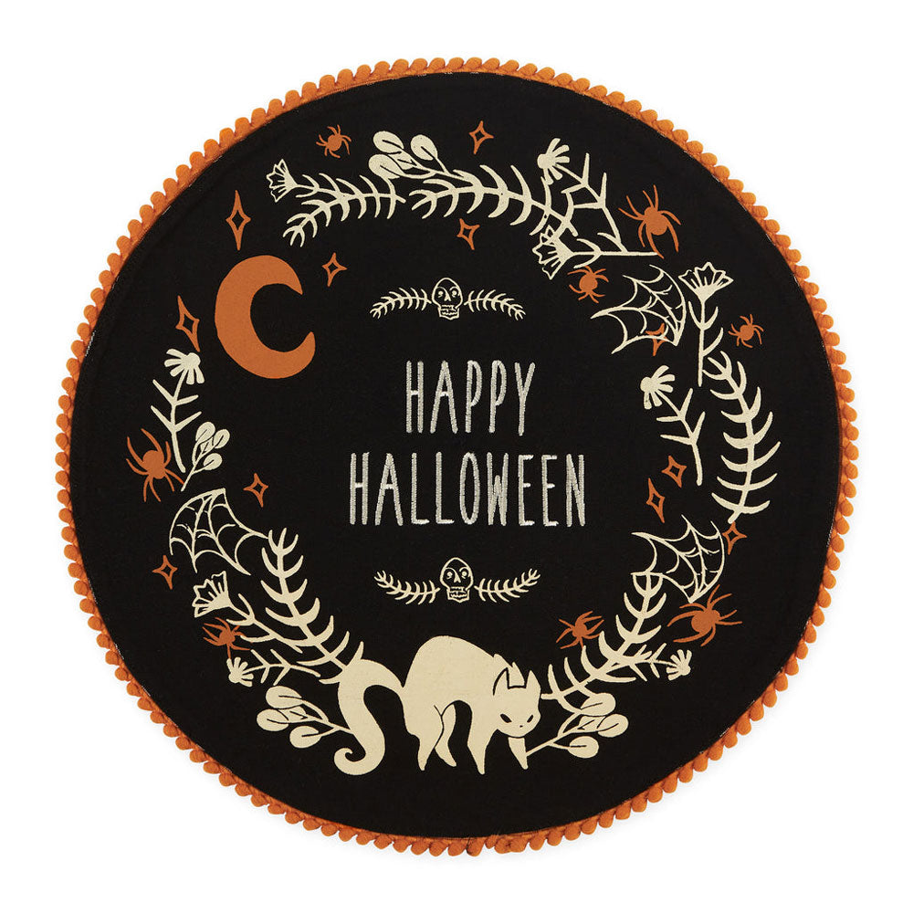 The Spooky Wreath Embellished Round Placemat is reversible, fused and lined. It is embellished with embroidery, print, and mini pom-pom trim. 15 x 15-inches and100-Percent Cotton - Exclusive of decoration. Hand wash cold • Line dry • Low iron