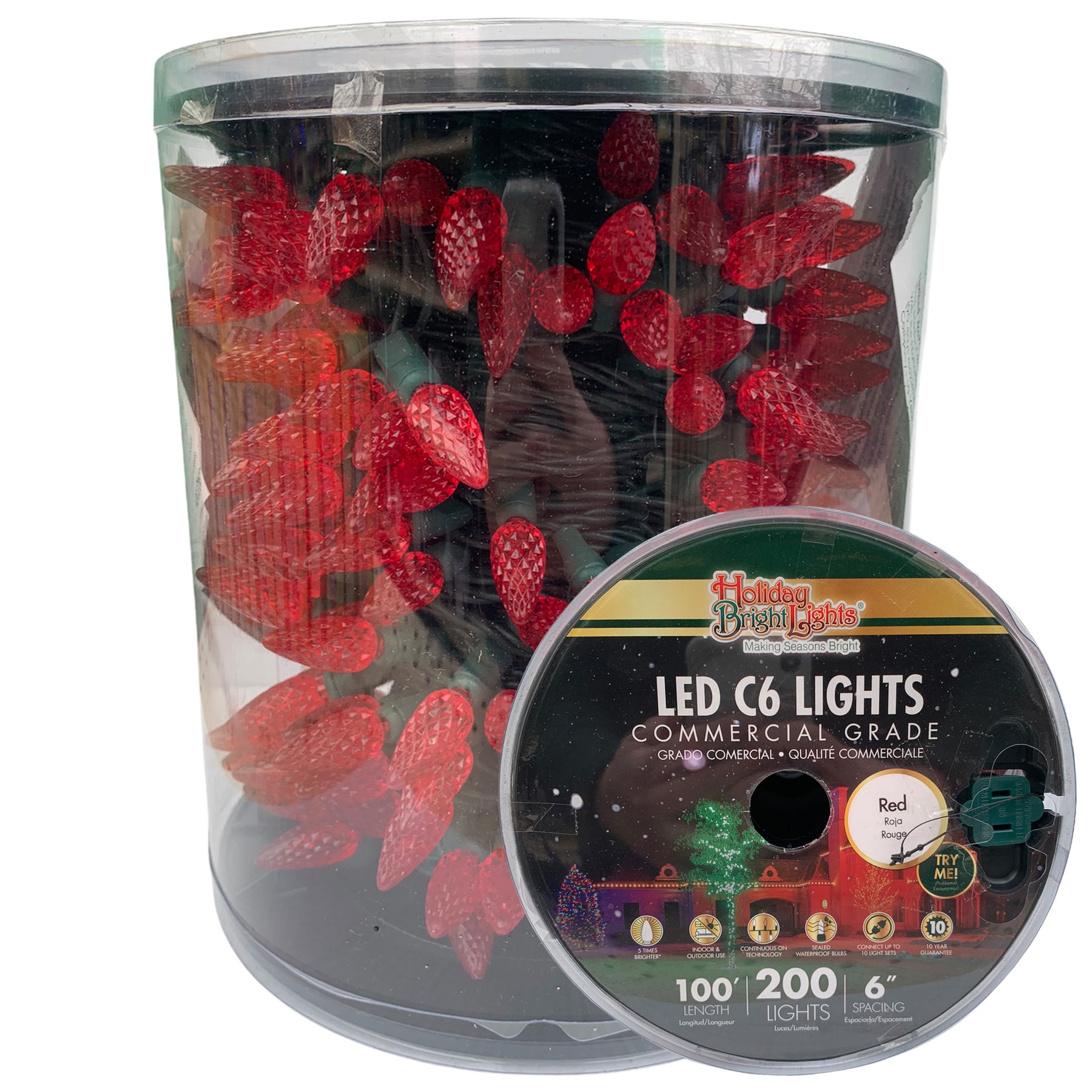 Holiday Bright Lights - 100' LED Commercial grade 200 red lights. Connect up to 10 sets for over 1,000 ft. of total coverage. Save 90% energy! Bulbs won't burn out or become loose. Set will stay lit, even if an individual bulb somehow goes out. No glass bulbs to break. Cool to the touch. Tangle-free wire, UV protected so colors won't fade. Guaranteed for 10 years, 10,000 hours.