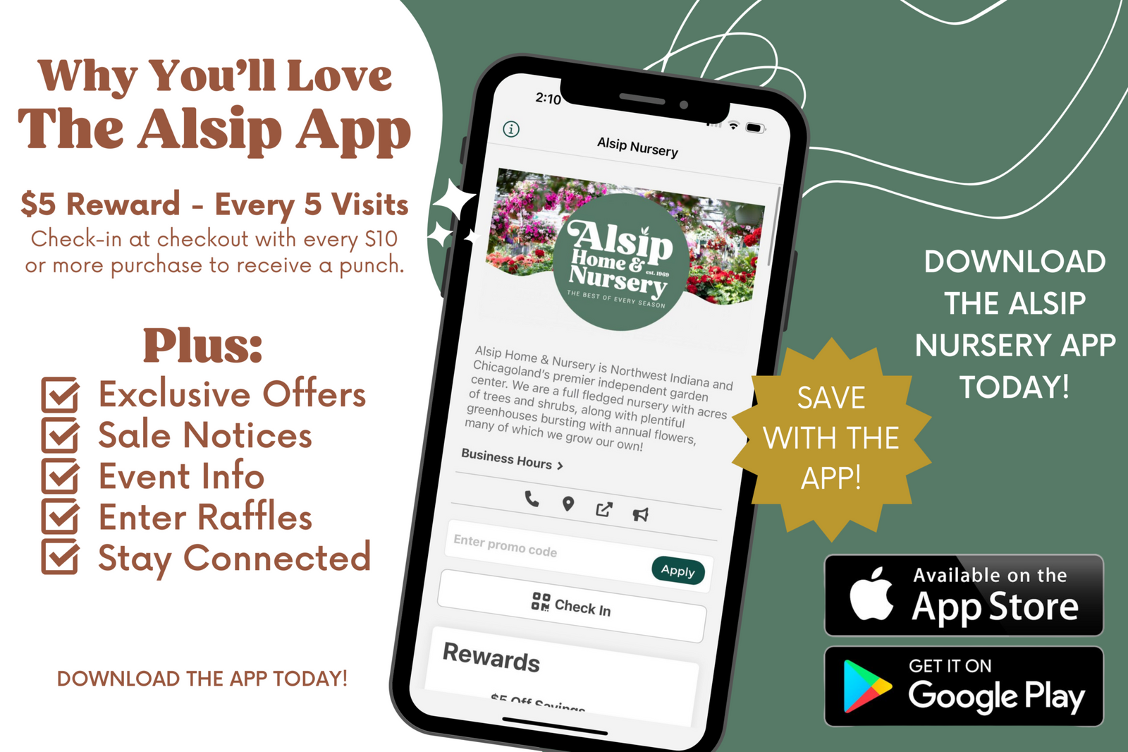 The Alsip Home & Nursery Reward App is here! We want to give our customers the opportunity to earn extra rewards and stay in the know!