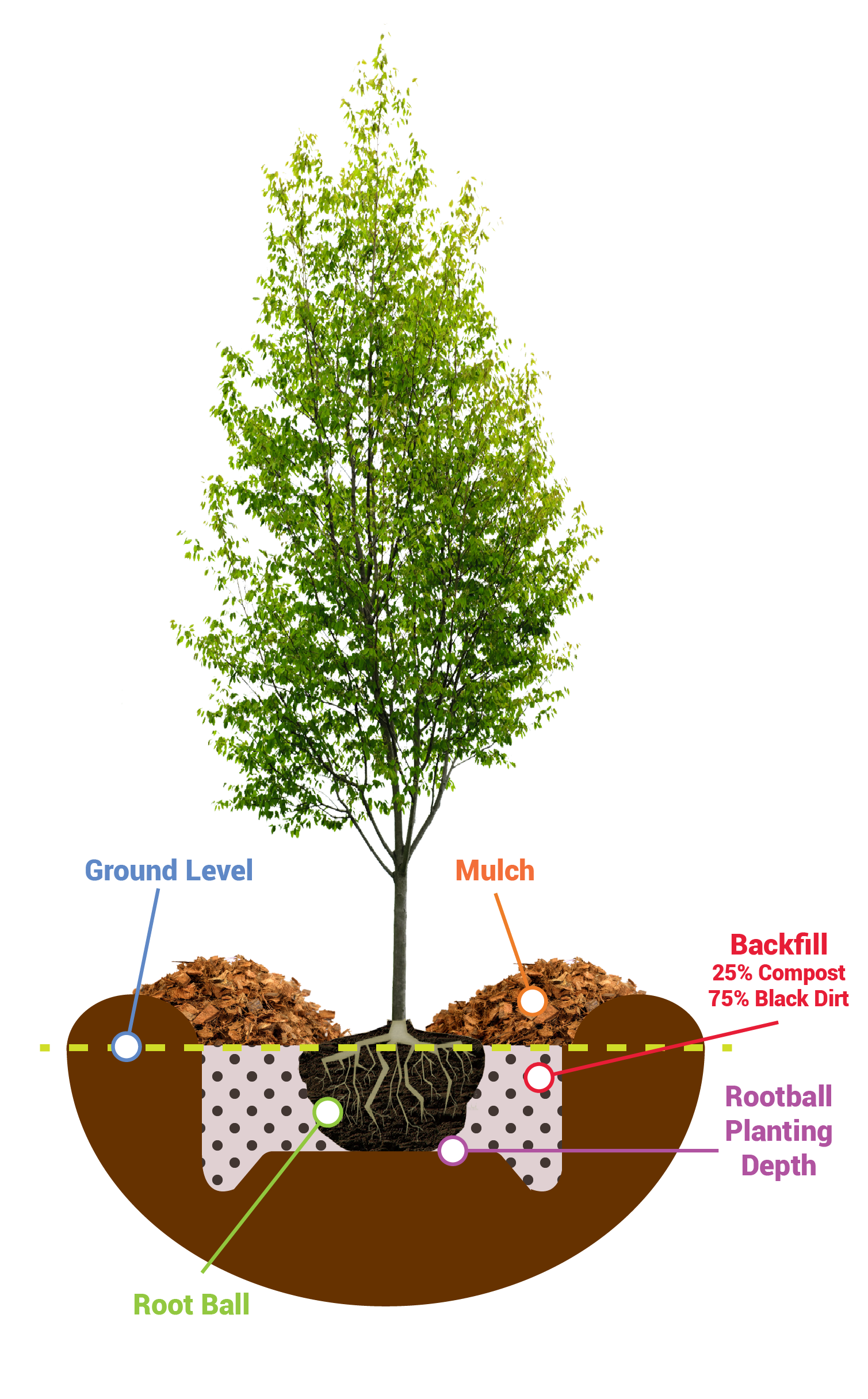 (Example: 24”W x 24”H Root Ball requires a 48”W x 24”H ) Leaving 1” - 3” higher than grade in heavy clay soils.